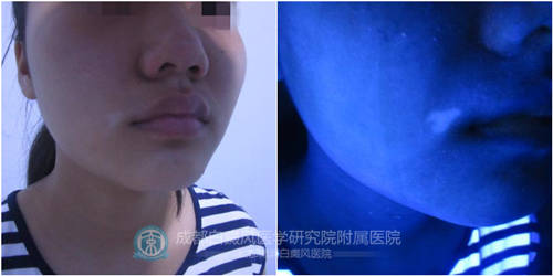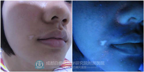 5、wood灯:面部有斑片状色素脱失性白斑,边界不清晰