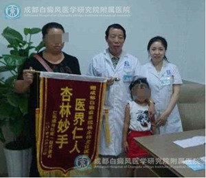 (康复后的佳佳,跟随母亲一起来到医院,将一面绣有“医界仁人,杏林妙手”的锦旗,送至林永祥主任手中,感谢林主任的治病之恩。)