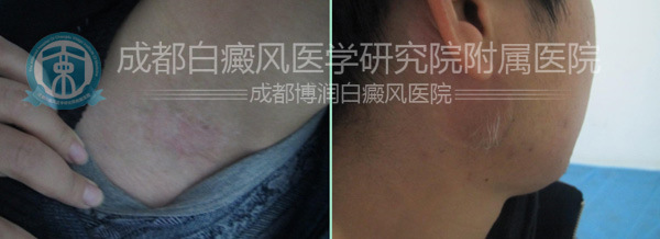 重庆市沙坪坝区的陈某某,18岁时患上白癜风,右侧耳后、颈部、胸部均有白斑。来我院治疗前,陈先生曾在重庆某家公立医院治疗过,自己购外用药治疗,都没有治好身上的白癜风。后来到成都白癜风医学研究院附属医院就诊治疗,3个月后,白斑消失。