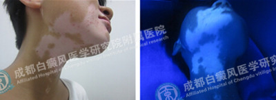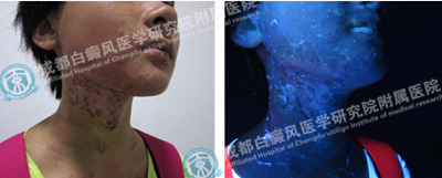 1、伍德灯检查:面部白斑色素脱失严重,边缘模糊;