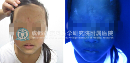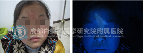 1、伍德灯检查:面部白斑色素不完全脱失,边缘模糊;