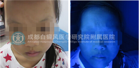 初诊时,李雪面部的白癜风在wood灯下显示色素脱失严重,边缘模糊,处于进展期