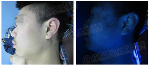 ▲伍德灯:面部白斑色素脱失