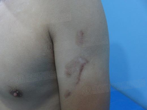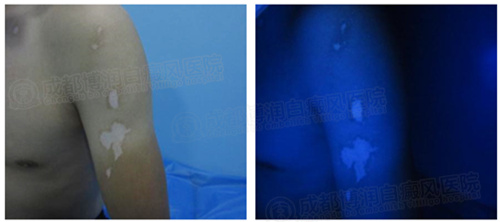 3、wood灯:胸部、左侧肘部、白斑色素脱失约为89-98%
