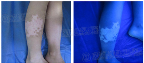 wood灯:左下肢  有斑片状色素脱失性白斑,边界不清晰
