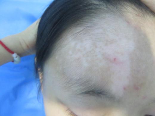 现病史:本人自诉右侧额部白斑7年,曾在成都其他综合医院、皮肤医院治疗无效果,遂来我院治疗。