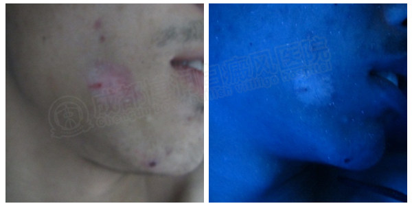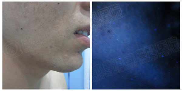 ▲Wood灯:右侧眉部、右侧颈部、右胸部、左侧髂嵴、脐部均有不同程度色素脱失性白斑