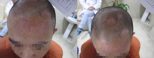现病史:患者于2个月前发现额头白斑,在德阳当地医院治疗过1个月,用药不详。今日来我院继续治疗。