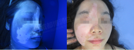 现病史:患者诉面部白斑1年,加重半年。2015年1月在康定某医院未治疗。2015年5月在华西治疗,口服甘草酸、善存、外用他克莫斯、每周两次308治疗。治疗无效,于今日来院就诊。