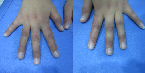 阳阳的手指有蜕皮的情况,每到蜕皮的时候,阳阳无聊的时候就会撕掉那些皮肤,慢慢的,阳阳手指就处于一种常年蜕皮的状态。两年前,阳阳的手指开始泛白,父母发现后觉得不对劲,但由于工作有点忙,就去医院开了药之后不怎么关注了。谁知道,阳阳的手指白斑越来越大,较后竟然几乎布满整个手!这让阳阳的爸爸妈妈陷入恐惧当中,并且开始四处寻医寻药。