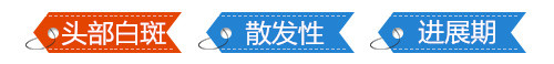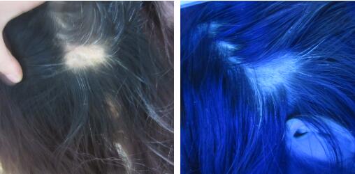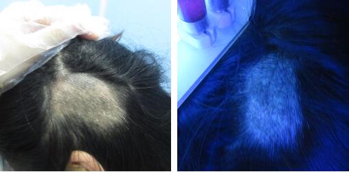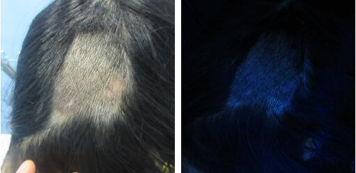 wood灯:头部有斑片状脱失性白斑,边界不清晰。