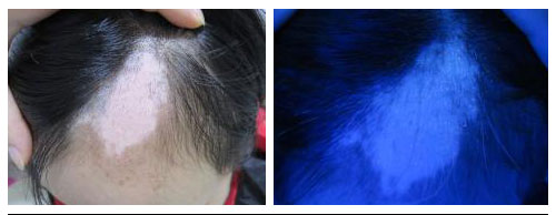 1、wood灯检查:头部、眼角、腹部不同程度色素脱失