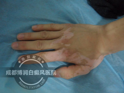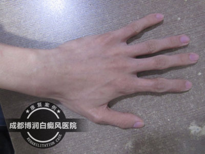 1、wood灯:双手均有不同程度的色素脱失。