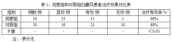 选取各类型白癜风患者100例,男46例,女54例,年龄为16~45岁,平均年龄为(30±0.5)岁,白癜风病程为1m~5y,平均病程为(2±0.5)y,其中局限性白癜风28例、散发性白癜风34例、泛发性白癜风22例、肢端性白癜风16例;白癜风处于进展期87例、白癜风处于稳定期13例。所有患者均无其他严重心、肝、肺等系统疾病,在征得患者及家属同意的情况下,将所有患者按就诊顺序编号随机分为对照组(50例)和观察组(50例),两组患者临床资料差异不明显,在统计学上无意义(P>0.05),具有可比性。