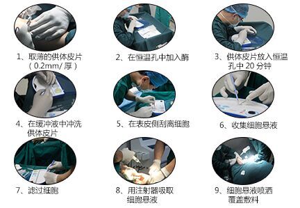 黑色素细胞自体体外再生便是首先从患者正常皮肤取一片薄的皮片,用Recell一次性独立自体细胞搜集器制成的活细胞悬液培养,促成黑素细胞体外再生,从而“上喷”在创面,从而达到黑素细胞的恢复,迅速使皮肤的正常色素沉着,使得白癜风康复的几率大大增强。