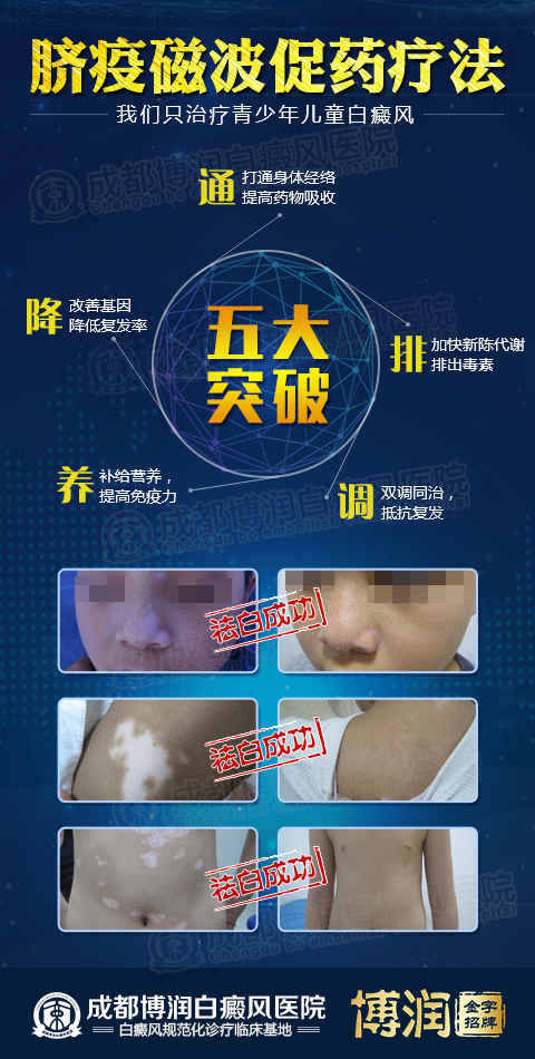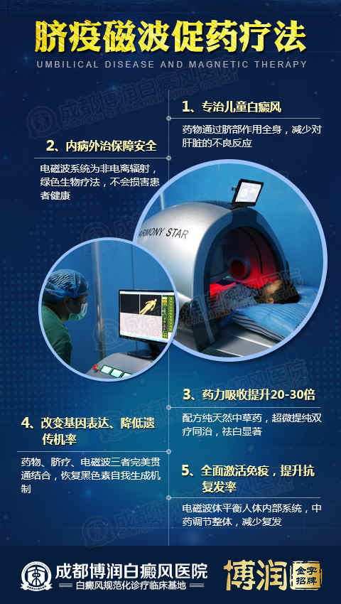 成都博润白癜风医院作为川内成立较早的,西南地区(目前)规模较大、诊疗系统较为全面的白癜风诊疗机构。同时也是四川省皮肤病性病学质量控制授予的四川地区的“白癜风规范化诊疗临床”,一直将青少年白癜风防治工作作为重点。脐疫磁波促药治疗,针对3-12岁儿童白斑,专业设施,专病专治,解决青少年儿童治疗无效,用药不对症的情况,保障疗效的同时,更将儿童身体健康放在首位。