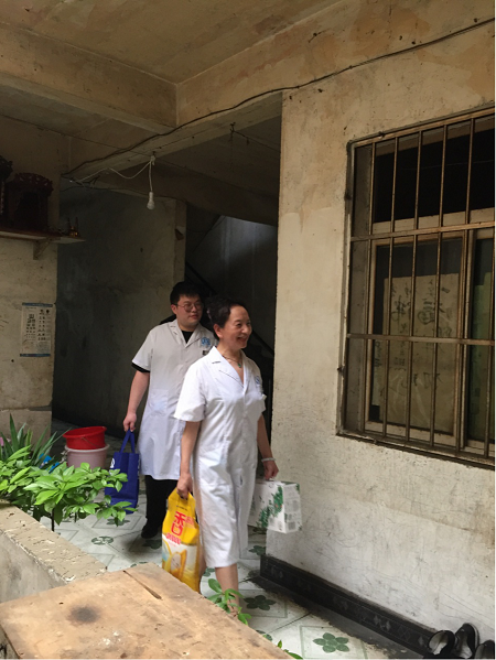 今年7月8日,马晶主任带领成都博润家访小组,冒着酷暑,探望之前在院治疗过的患者王大姐,并为王大姐家送了米、油、牛奶等生活用品。